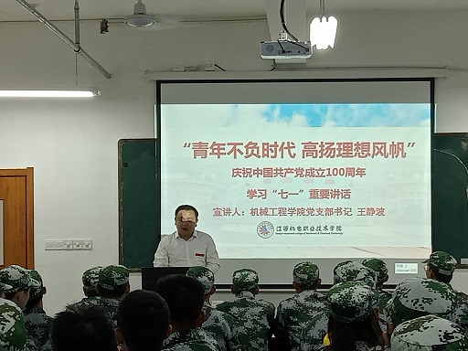 王静波以“青年不负时代 高扬理想风帆”——庆祝中国共产党成立100周年为题,带领同学们深入学习了习近平总书记“七一”重要讲话精神,介绍了伟大建党精神的深刻内涵。