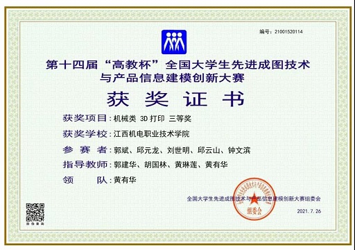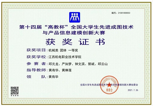 7月24日——26日,第十四届“高教杯”全国老员工先进成图技术与产品信息建模创新大赛在西南交通大学成功举办。公司获得机械组团体一等奖、3D打印团体三等奖的好成绩。黄有华、黄琳莲两位老师指导的7名参赛选手中, 20级数控1班严如梦、20数控3班邱元龙2位同学荣获个人全能一等奖,19级机制班钟文滨、19机制本科班郭斌、20级数控2班邱云山、18级机制1班陈昊4位同学荣获个人全能二等奖,19级机制本科班刘世明荣获个人全能三等奖。