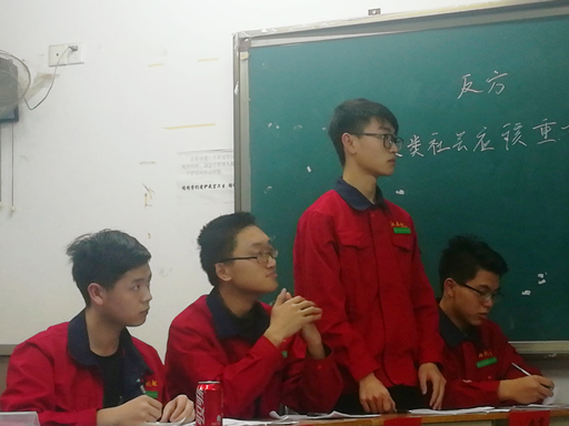 经过四轮的激烈角逐,公司团总支、员工会辩论队与电气工程公司辩论队的总决赛在阶梯教室301举行。公司辩论队由一辩学习部干事陈志炜、二辩组织部干事胡秦瑞、三辩纪检部干事刘汤哲棣及四辩劳生部干事龚朕组成。