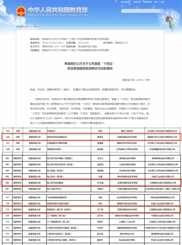 近期,教育部办公厅发布了《关于公布首批“十四五”职业教育国家规划教材书目的通知》,XC体育共有3部教材入选,其中叶水春教授主编的《电工技术应用基础》、王广明教授主编的《高等数学(理工类 多学时)》入选高职组教材名单,柳荣华教授主编的《数控车床综合技能实训》入选中职组教材名单。